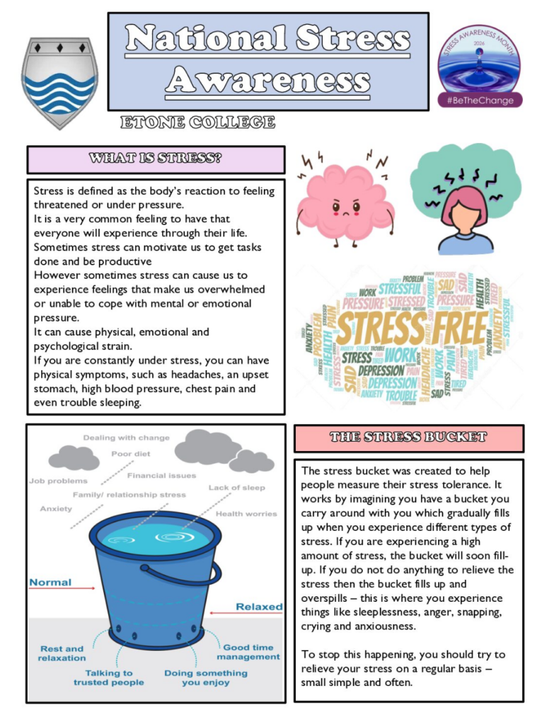 The assembly this week will also follow on the theme of Stress Awareness and in addition to that, there will be a follow-on form time activity which is attached for your information (Stress Bucket).