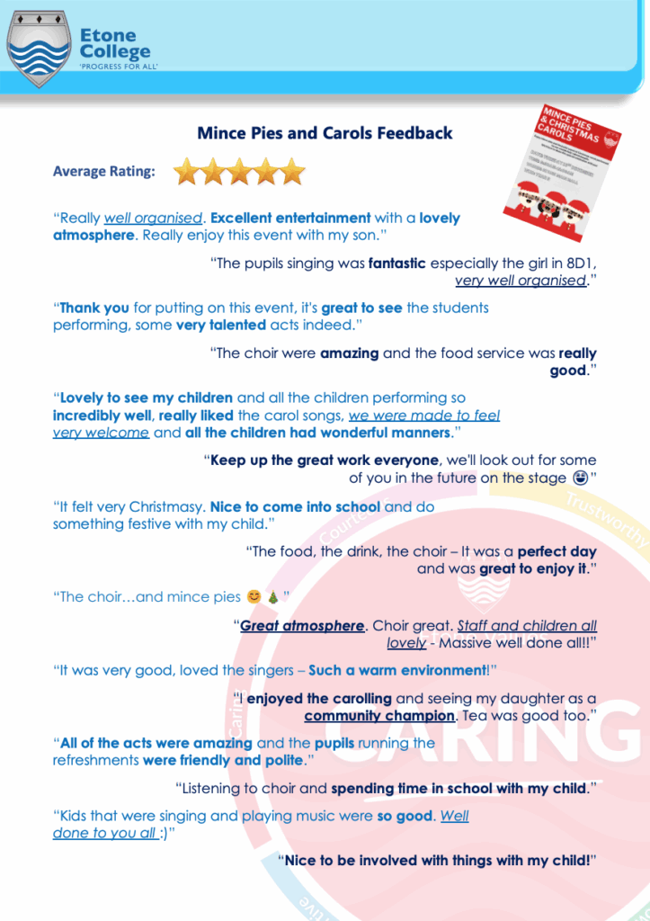 On Tuesday we welcomed over 100 year 7 and 8 parents to the Etone College to attend our annual Mince Pies and Carols event. The performance is always well attended and this year was no different. With the choir singing some festive treats along with an audience rendition of Last Christmas there was fun aplenty. Whilst the joys of the singing were going on our Community Champions were being their amazing selves and delivering mince pies and yule logs to our guests, all the while raising funds for Save the Children. Bringing our total raised to over £400 for the charity this year. The event is an important aspect of our calendar as it helps to support our pupils and parents whilst raising funds and festive cheer all around. Thank you to all of those in attendance.