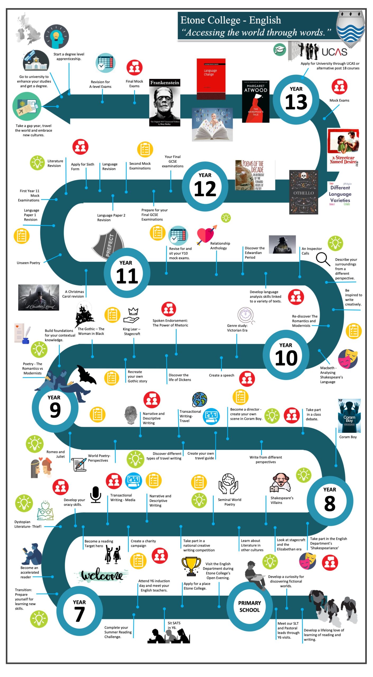 Studying English is not just about reading books, although an important aspect of our curriculum is promoting a love of reading. Our learners are developed into experts through the exploration of language and literature throughout the curriculum, having the opportunity to study the best of literature both historically and locally whilst enhancing their communicative skills through the written and spoken word.