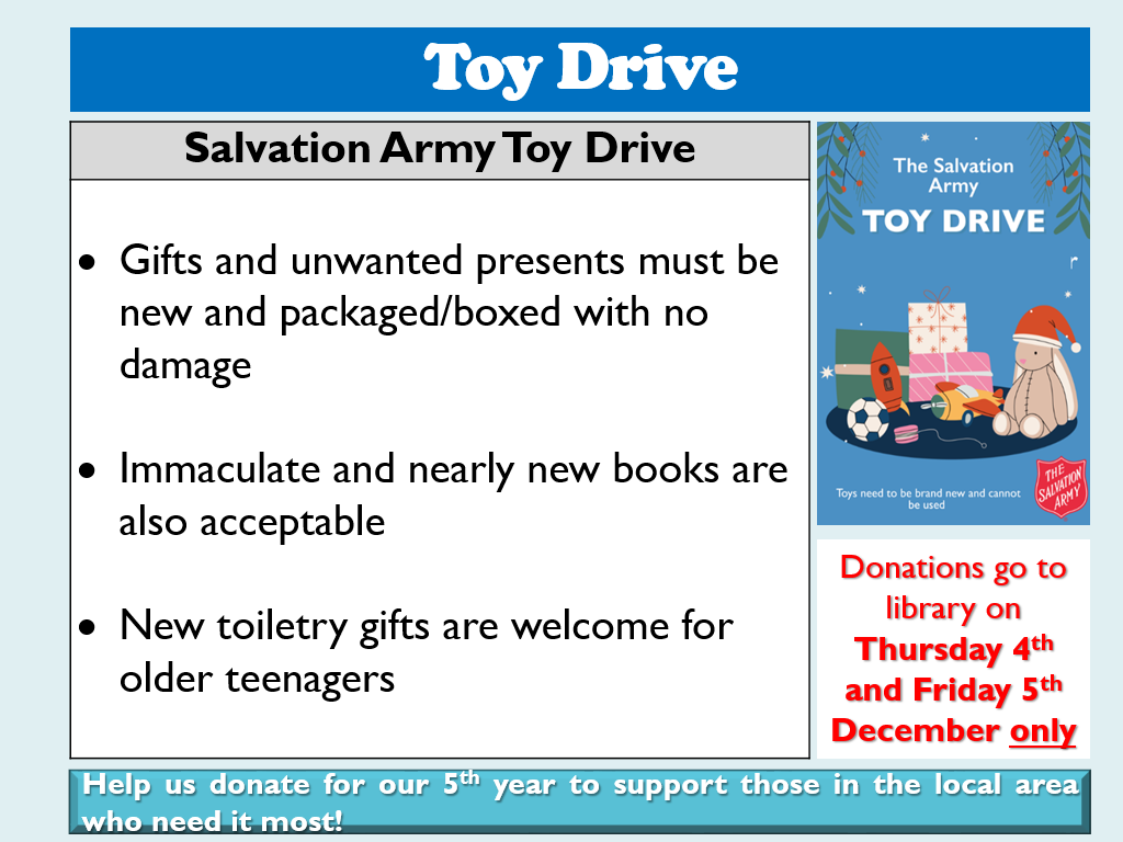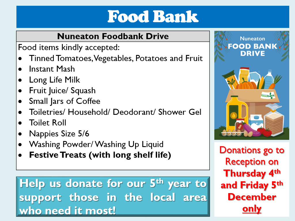 If you are able to take part please bring your food in on Thursday 4th and Friday 5th December and give it in at reception. The list of accepted items are on our poster. Our fantastic Charity Committee will be taking the food on Monday 12th December to the Foodbank to do the handover.