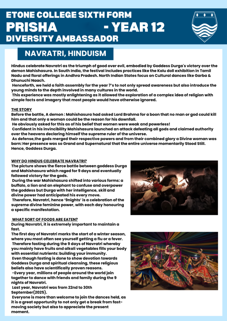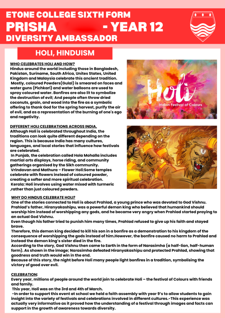 Prisha G, a Year 12 student and one of our Diversity Ambassadors, has played an active role in co-delivering a series of multi-faith assemblies to younger pupils throughout this year. Alongside this, she has written two informative articles on key Hindu festivals, Navratri and Holi. We are proud to celebrate and represent a wide range of faiths and beliefs at Etone College Sixth Form, helping to broaden students’ understanding and appreciation of different religions and cultures! Well done Prisha!