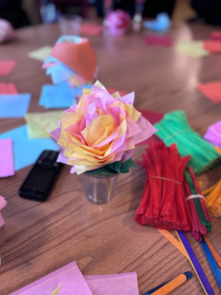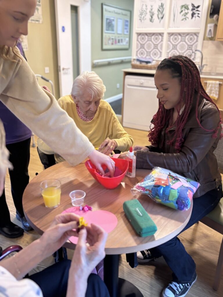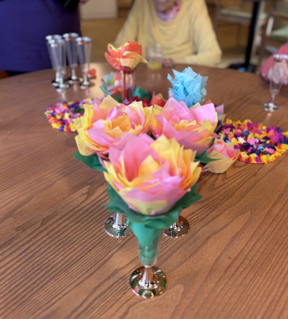 Last week, they helped decorate the tables for Valentine’s Day by making paper flowers. As they worked, the conversation soon turned to memories of getting ready for dates in their younger days. Residents laughed as they shared how they would curl and pin their hair and even use tea to tan their legs.