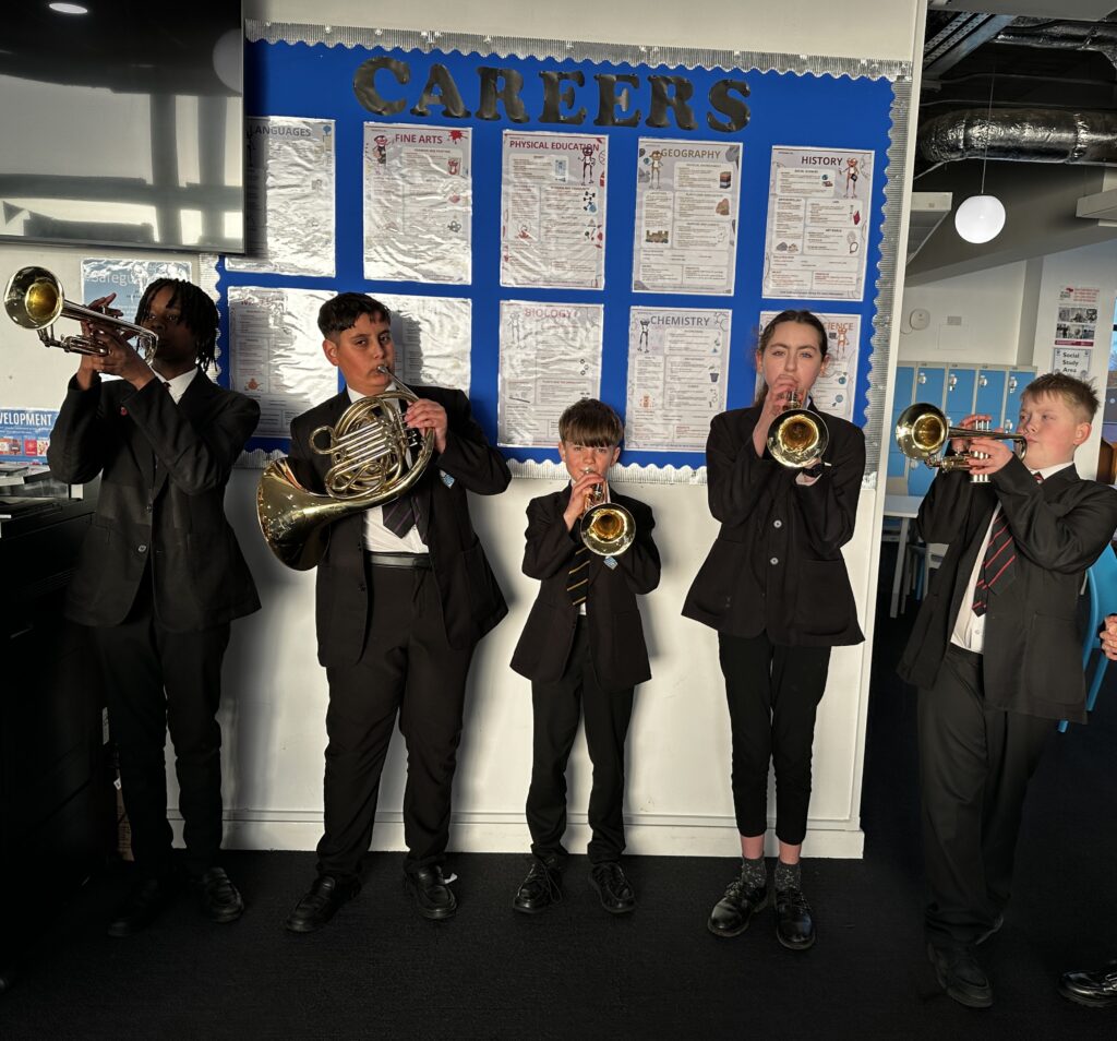 A group of Etone College students have been chosen for a pilot project by the Warwickshire Music Service to have a go learning trumpets, French horns and trombones. The project is aimed at getting more students involved in learning to play brass instruments and the students are having their lessons at the North Area Music Centre (hosted at Etone College 6th Form) and are receiving lessons with Mr Pugh, the head of the North Area Music Service. Mr Pugh said he is enjoying the enthusiasm of our students and is especially impressed by the students who have been practising every day!